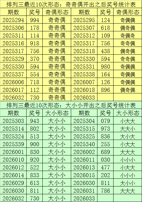陈列三最近10次同期开稀奇偶格局:奇奇偶和大小格局:大小小时其奖号差异为:734-934-934-534-510-714-514-532-514-512-730,下期差异开出号码为:159-309-771-672-816-972-641-178-877-148,详备统计见下表: